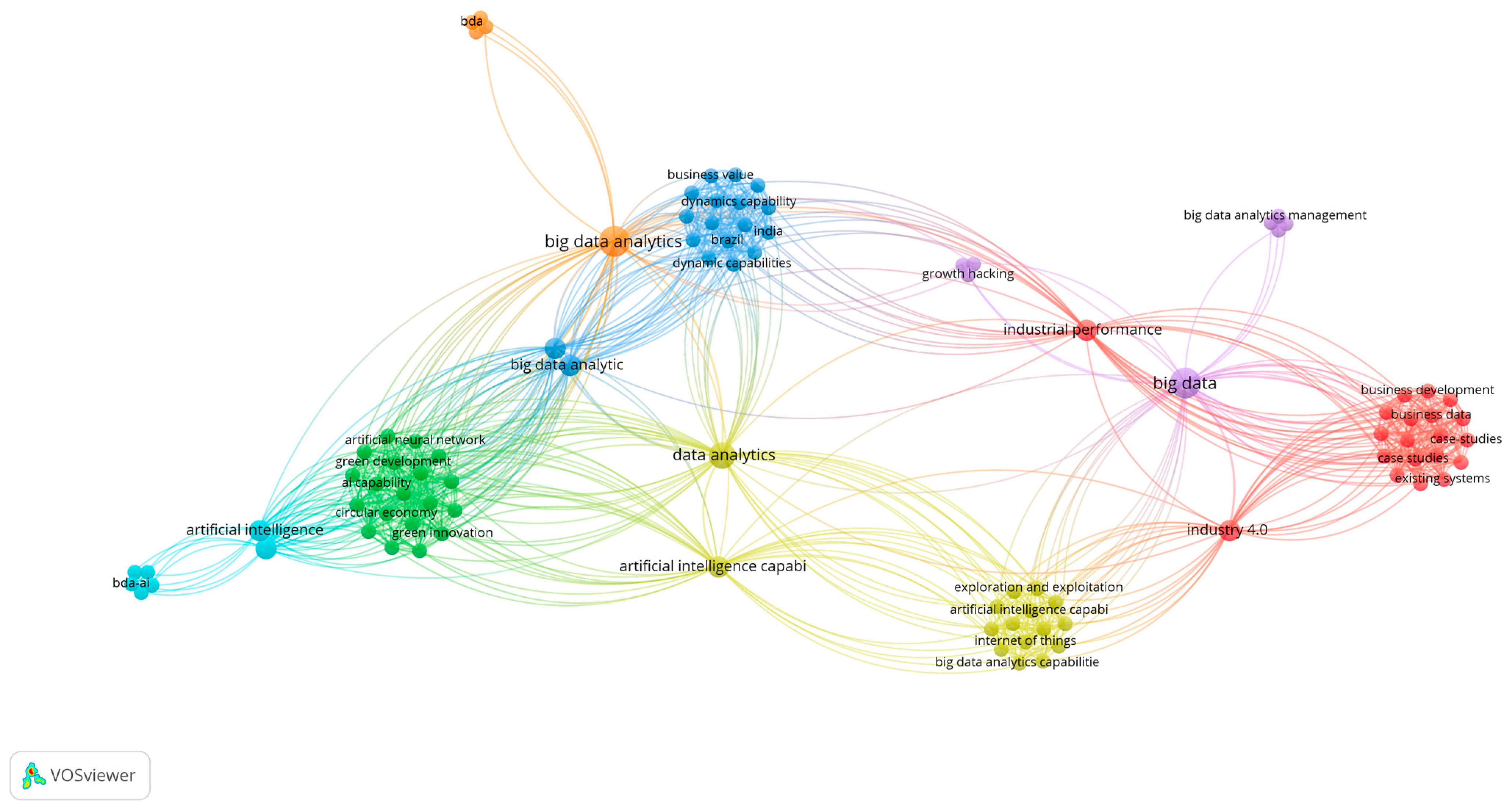 As shown in Figure 1, the overall results of the ten-year analysis period showed 98 related keywords, with the most frequent BDAC-related keywords—big data and big data analytics. The stream of research related to BDAC studies is visualised in the yellow cluster. It directly belongs to the technological framework that is expressed in proximity to the artificial intelligence (AI) and Industry 4.0 keywords. In the academic literature, researchers emphasise the impact of BDAC on business performance [24,25]. Figure 1 also demonstrates that in the historical context, BDAC has an indirect relationship to business development (red cluster), business value (blue cluster), and green development (green cluster), guided by the technology perspective. That positions BDAC conceptual studies in a complementary role in relation to the well-established Industry 4.0 research stream.