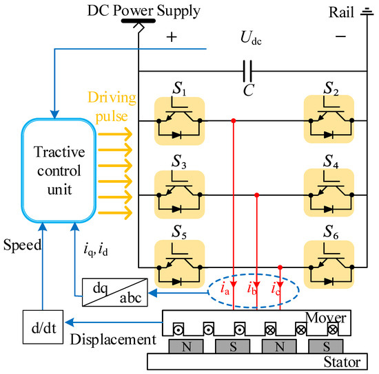Figure 2 illustrates a driving circuit for a PMLSM. The system is powered by a direct current (DC) source, with a capacitor C smoothing the voltage to provide a stable DC voltage Udc for the motor. A traction control unit modulates the motor’s operation based on the train’s speed and displacement. This control unit generates driving pulses that control the on–off states of six power switches (S1 to S6), which form a three-phase H-bridge circuit and regulate the three-phase currents (ia, ib, and ic) of the motor. The stator of the motor is equipped with three-phase windings, while the mover (rotor) is mounted with permanent magnets, creating a permanent magnetic field. As the three-phase currents pass through the stator windings, they generate a rotating magnetic field that interacts with the permanent magnets on the mover, producing the thrust required for linear motion. The figure also displays feedback loops for current and displacement, which are used for closed-loop control to precisely regulate the motor’s speed and position. Through this control method, the PMLSM is capable of achieving efficient and accurate linear motion.
