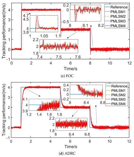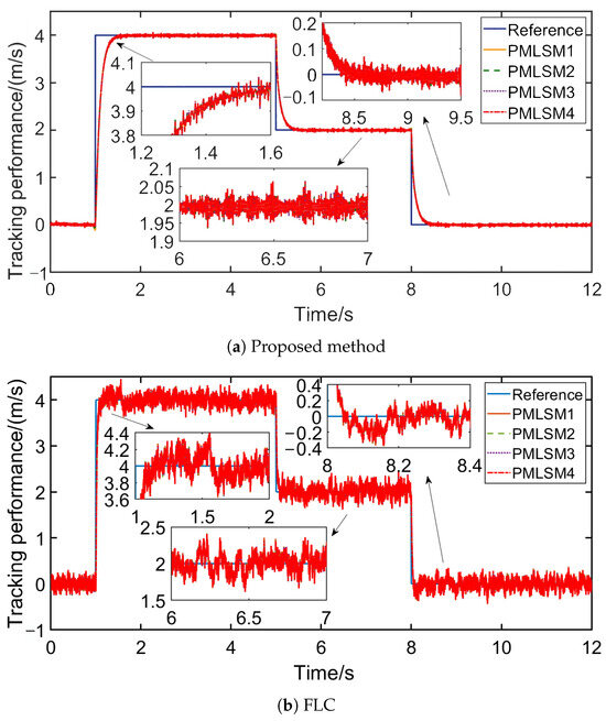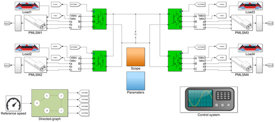 Faults may cause adverse effects to multi-PMLSMs, such as longer synchronization times and low tracking accuracy. In recent years, for the sake of decreasing the influence brought by faults on industrial systems, some authors have proposed fault-tolerant control, a method to guarantee that the system runs safely when actuator faults arise. For example, in [25], an adaptive fault-tolerant control strategy is devised for dual three-phase permanent magnetic synchronous machine drives, which increases the reliability of the drive system by applying unified fault-tolerant reference currents. In [26], a fault estimation and tolerant control is designed for high-speed trains, using real-time fault estimation and control of the system state to track the desired trajectory accurately. In [27], an active fault-tolerant cooperative control scheme is established to maintain the desired tracking performances and cooperative performances, achieving the cooperative control of multiple high-speed trains affected by unknown parameters and actuator faults. Also, in [28], a model-free adaptive iterative learning control method based on data-driven control is proposed, which achieves the cooperative control of multiple subway trains in the presence of speed sensor faults and provides overspeed protection, ensuring that the trains operate within a safe speed range, etc. To sum up, fault-tolerant control is an effective method to handle various faults and to make the system more resistant to the threat of faults [29]. If applied in multi-PMLSMs, fault-tolerant control will have the potential to ameliorate reliability under the actuator faults of the system.