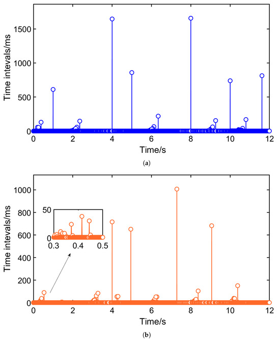 Time intervals of the event-trigger generators 1 and 2, (a) shows the intervals for generator 1, and (b) shows the intervals for generator 2.
