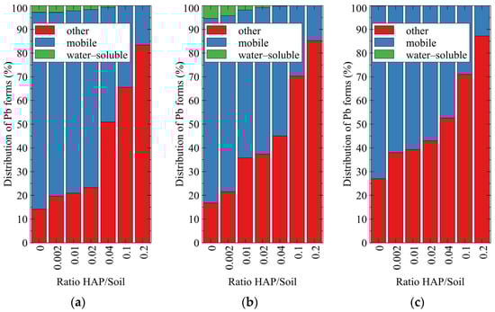 Dependence of the proportion of the lead fraction on the HAP/soil mass ratio: (a) Luvic Anthrosols, “Experiment A”; (b) Luvic Anthrosols, “Experiment B”; and (c) Gleyic Cambisols.