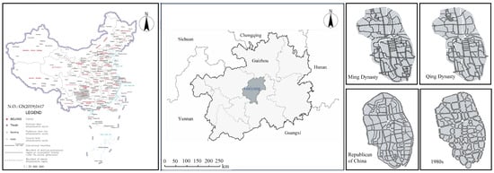 In recent years, particularly in developing countries, how to balance urban modernization with the preservation of historical and cultural districts has become a major challenge in urban development. These districts not only preserve rich history and culture but also play a key role in urban development [1]. However, urban expansion and modernization often impact these areas. The expansion and modification of road networks have particularly profound impacts, not only altering the spatial structure and functionality of regions but also exerting significant effects on the economic and social environments of surrounding communities [2]. To understand why there has been an increasing focus on heritage preservation in these historic districts, it is essential to trace the historical context of the city and explore the historical significance of these districts as cultural heritage. Historical and cultural heritage not only represents the historical memory of a region but also serves as the core of local cultural identity. The historic districts of Guiyang are a key manifestation of this cultural heritage. China, as the most populous country in the world with vast territory, boasts a rich cultural heritage and diverse geographical environments. The challenge of effectively preserving historical and cultural districts while optimizing urban spatial planning during the rapid urbanization process has become an urgent issue to address. Since the Ming Dynasty, China’s overall strength has lagged behind the West, particularly during the late Qing period, with low productivity, and it remains a developing country today [3]. Over the past 600 years, China’s social, economic, and spatial structures have undergone profound changes [4], especially with urbanization reshaping urban spaces [5]. Guiyang, a major political, economic, and cultural center in southwest China, became a strategic location in the Ming and Qing periods, connecting inland China with Southeast Asia and fostering cultural exchange among various ethnic groups [6]. Over time, Guiyang developed into a multi-ethnic city with a unique local culture. However, rapid economic growth and urbanization have significantly changed construction land and road networks in its historic districts. These changes have altered the city’s landscape and impacted residents’ quality of life and cultural heritage preservation. Therefore, the preservation of the cultural heritage in these historic districts and ensuring its proper transmission during the process of modernization have become crucial issues in urban development. Furthermore, studying the changes in construction land and road network connectivity in Guiyang’s historic districts can offer insights into the relationship between urban development and cultural preservation, providing valuable lessons for other cities.