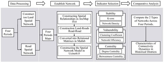Concurrently, research on road space networks includes studying road centrality, optimizing road system efficiency [27,28], integrating road networks with public transportation systems [29], and further optimizing existing road infrastructures as demonstrated by Alec et al. in their study on the invariance of intermediacy centrality in planar network structures [30] and Fan et al., who examined changes in the centrality of Changsha’s road system [31]. Additionally, studies on construction land focus on the impact of institutional changes on land use [32,33]. Based on the above analysis, current studies on the morphological changes of historical district urban forms using spatial complex networks are relatively limited. Such research is instrumental in deepening the understanding of the city’s historical and cultural contexts, enabling urban planners to accurately capture the dynamic changes of the city. By analyzing the evolution and current state of historical districts, planners can more effectively formulate future development strategies, ensuring the continuity of urban development and the preservation of cultural heritage.