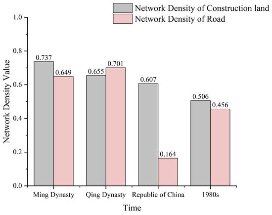 As shown in Figure 3, from the early Ming Dynasty to the 1980s, the density of the construction land spatial network displayed a linear declining trend, while the road network density showed a fluctuating decline. This indicates that the variability of the road network is higher than that of the construction land spatial network during urban development, reflecting the relative stability of construction land spaces and the flexibility of road usage, particularly influenced by changes in transportation modes with frequent adjustments. Over approximately 600 years, the density of the construction land spatial network gradually decreased from 0.737 in the early Ming Dynasty to 0.655 in the early Qing Dynasty, 0.607 during the Republic of China period, and 0.506 in the 1980s. This change demonstrates a slow evolution of urban spatial forms, where the spatial pattern of historical cultural districts has maintained historical continuity to a certain extent, showing significant stability. However, the connectivity of the spatial network in historical districts has also gradually declined. Based on this, the construction and management of current historical cultural districts should actively promote the enhancement of spatial network connectivity while preserving historical spatial forms, aiming to balance historical integrity with modern needs.