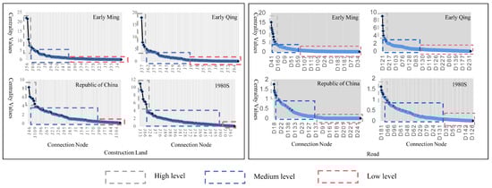 As shown in Figure 4 and Table 5, the betweenness centrality of construction land nodes over the four periods can be divided into three levels based on the descending order of the line graph. The first level has high betweenness centrality values with large variations and a small proportion of nodes. The second level has more nodes, with betweenness centrality values lower than the first level and decreasing more gradually. The third level has low betweenness centrality values, with small and gradual decreases, and contains more nodes than the first level. Over time, the number of nodes in the first and second levels of the construction land spatial network increases, with the second level showing the largest increase, while the number of nodes in the third level decreases. The road network exhibits a similar pattern, indicating that both networks tend to develop more evenly over time. This phenomenon is closely linked to the evolution of social systems and economic structures. During the feudal era, political systems emphasized centralization and strict hierarchical order, causing urban spaces to exhibit a “pyramidal” center-grade structure, where a few key nodes possessed high centrality. With societal transitions and political reforms, especially since the reforms and opening up and the liberation of thought in modern times, society has advocated more for diversified and balanced development. Correspondingly, urban planning concepts have gradually shifted from a traditionally dominant single-center model to a modern urban spatial pattern with multiple centers and levels. This is reflected not only in the construction land spatial network but also in the road network structure.
