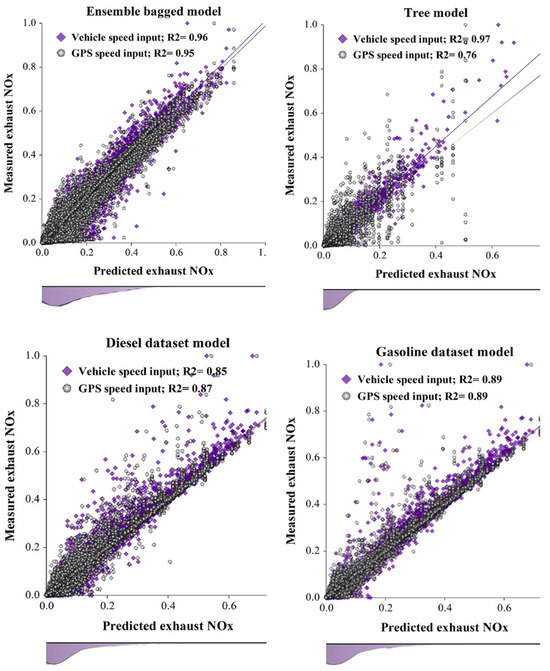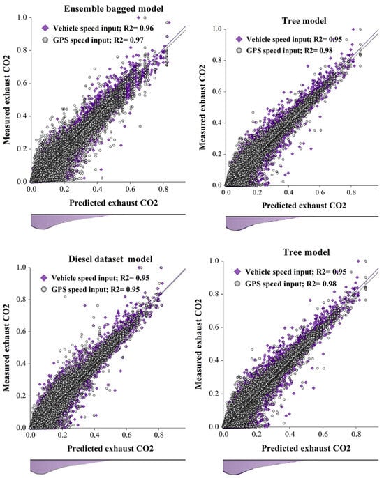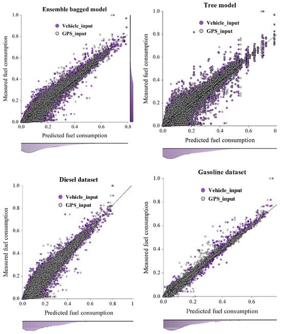 Ensemble and decision tree models were used to predict fuel rate, which measures instantaneous fuel consumption of two exhaust pollutants: and . The model results are presented in Table 2, and the regression scatter plot showing the predicted and measured value relationship is shown in Figure 2. The results are presented in two categories. The first is an evaluation of modeling fuel consumption using the mixed diesel and gasoline dataset for the vehicle and GPS speed input classes. The second category evaluates the performance of the ensemble bagged algorithm on the single diesel and gasoline datasets for the vehicle and GPS speed input classes.