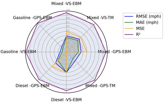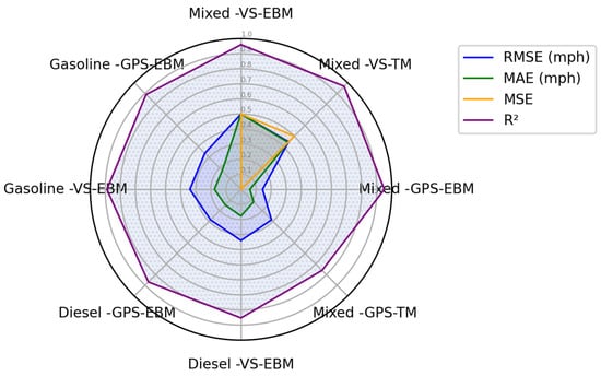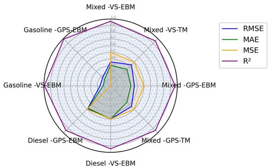 The comparison of models trained on individual gasoline and diesel datasets versus the combined dataset underscores the importance of data diversity in machine learning applications. The high accuracy achieved with gasoline datasets could be attributed to the consistency of input parameters, whereas the slightly lower performance for diesel engines points to potential variability in data quality or inherent differences in engine behavior. Figure 5, Figure 6 and Figure 7 present a detailed summary of the models’ comparison using a radar chart. In these Figures, the performance metrics were normalized to between 0 and 0.5 to scale their visual representation while ensuring that R2 remains distinguishable.