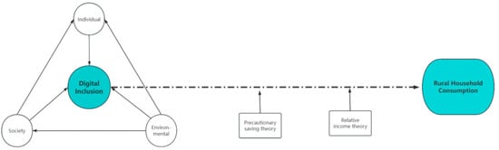The triple interaction theory was proposed by Bandura, an American psychologist, who argued that human agency is a product of the interaction between personal, behavioral, and environmental factors that play a role in the structure of interaction [28]. In the context of digitalization, addressing the digital divide in rural areas and achieving digital inclusion is not only an integral component of integrating urban and rural development but also represents the pinnacle of social inclusion in the digital age. It serves as a catalyst for transforming the digital disadvantage experienced by rural residents into digital inclusion [29]. The formation of the rural digital divide results from the interaction between individual, social, and environmental factors [30,31]. Digital inclusion, acting as a bridge that connects individual capacity improvement with social and equitable development, must be achieved through the systematic integration of individual participation, institutional support, and environmental optimization [32]. By integrating the precautionary savings theory and relative income consumption theory, the research scope broadens to encompass economic behavior, revealing the profound impact mechanism of digital inclusion on rural residents’ consumption. This mechanism is shaped by the interplay between risk perception (environmental uncertainty) and consumption decisions (individual behavior). Therefore, this paper takes the triple interaction theory as the model reference to study the path of rural residents’ realization of digital inclusion, as well as the path of digital inclusion’s influence on rural residents’ consumption. At the same time, the precautionary savings theory and the relative income theory are introduced based on the triple interaction framework. As illustrated in Figure 1.