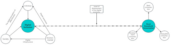 With the advent of the digital era, the development of the digital economy has become an important influence on the level of consumption [38]. In the process of promoting rural household consumption through digital inclusion, the digital economic development index can not only directly affect the construction of regional digital infrastructure but also likely impact residents’ awareness, thereby influencing the extent to which digital inclusion benefits rural household consumption. Specifically, the digital literacy fostered by the digital economy, including skills training programs and the popularization of digital payments, has the potential to enhance farmers’ awareness of digital risks and their trust in consumption [39]. New consumption models emerging from the regional digital economy, such as live-streaming e-commerce and community group buying, also play a significant role. These models can help strengthen rural residents’ consumption channels and willingness [40]. Furthermore, the construction of regional digital infrastructure, such as network coverage and the widespread adoption of terminal equipment, directly influences the ease with which rural households can access consumption information [41]. Accordingly, Hypothesis 3 is proposed and drew the causal path diagram of this paper as Figure 2.