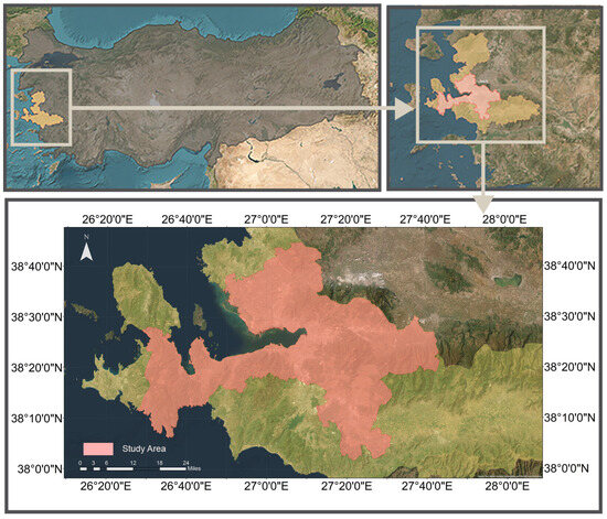 The case study area includes 11 central districts in İzmir (Balçova, Bayraklı, Bornova, Buca, Çiğli, Gaziemir, Güzelbahçe, Karabağlar, Karşıyaka, Konak, and Narlıdere), Turkey’s third-largest city in terms of population, where LULC changes caused by the metropolitan area are prominent. It also encompasses the districts of Menemen, Torbalı, Kemalpaşa, and Urla, which are located along the city’s development axis. The total surface area of the study area is 3489.02 km2 and the population has increased from 2,694,770 in 1990 to 4,320,519 in 2024. Located on the Aegean Sea coast in western Turkey (Figure 1) [59,60], the study area has a Mediterranean climate characterized by hot–dry summers and mild–wet winters [61]. Annual rainfall varies between 300 mm and 700 mm [62]. The vegetation in the study area is dominated by typical Mediterranean flora [63]. The geography of the region combines different landforms and geomorphological features, such as mountainous, rugged landscapes, caves, islands, lakes, and wetlands, which supports its richness in terms of natural landscapes, species, and vegetation [53].