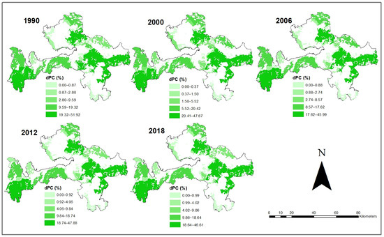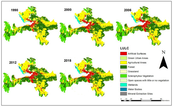 LULC maps of the study area for 1990, 2000, 2006, 2012, and 2018.
