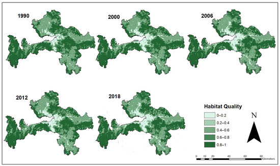 In this study, habitat quality values were calculated and mapped using the following equations with reference to LULC maps for 1990, 2000, 2006, 2012, and 2018;