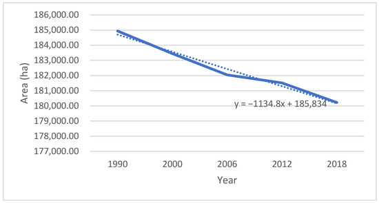 The changes in the number and size of the patches with high habitat quality between 1990 and 2018 were also analyzed. Accordingly, the number of patches increased from 469 in 1990 to 606 in 2018 (Table 9). However, there was a decrease in the average patch size (from 394.31 ha to 297.39 ha) and the total area (from 184,932.21 ha to 180,221.28 ha) (Figure 4).