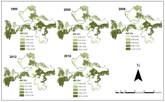 In this study, the delta versions of the IIC and PC indexes obtained with the Conefor 2.6 software were used to identify the nodes that are critical in terms of landscape connectivity within the patches with a high habitat quality. The delta version of the IIC (dIIC), which evaluates the connections between the habitat patches with a binary model, makes a simple assessment of whether or not there is a connection according to the size of the habitat patch, the distance between them, and the strength of the links between them, and expresses the importance of a patch as a percentage based on the change in landscape connectivity with the removal of the patch from the landscape. Based on a dIIC analysis of high-quality habitat patches between 1990 and 2018, there has been no significant change in the spatial pattern of important habitats in the immediate vicinity of İzmir (Figure 5). The calculation made with the delta version of the PC index, which calculates the connectivity between the patches with the probabilistic model by taking into account the probability of spread between two habitat patches, yielded a similar result (Figure 6). The dIIC and dPC results show that Mount Nif, in the east of the study area, and the Bozdağ foothills, which are partially located in the study area, constitute the most important habitats in terms of connectivity. The area located in the southwest of the study area, between the southern coast of the Urla district and the İzmir–Çeşme highway, is also critical for connectivity. The Mount Yamanlar foothills and associated patches in the north of the area are also among the most important patches in terms of connectivity.