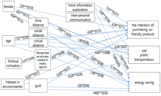 H1 (temporal distance) was partially supported, as it positively predicted public transportation use (β = −0.07, p < 0.001) and energy saving (β = −0.10, p < 0.001) but not purchase intention. H2 (social distance) was also partially supported, as it positively predicted public transportation use (β = 0.08, p < 0.001) and energy saving (β = 0.06, p < 0.001) but not purchase intention. H3 (virtual distance) was fully supported, as it positively predicted purchase intention (β = 0.12, p < 0.001), public transportation use (β = 0.07, p < 0.05), and energy saving (β = 0.05, p < 0.05). H4 (perceived severity of media coverage) was partially supported, because it positively influenced purchase intention (β = 0.06, p < 0.001) but not the other behaviors. H5 (guilt) was partially supported, significantly predicting purchase intention (β = 0.27, p < 0.001) and energy saving (β = 0.04, p < 0.05) but not the use of public transportation.