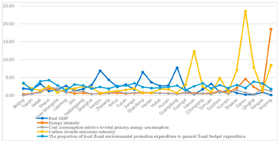 From the scores of the four perspectives, the score of resources utilization has achieved significant growth from 2015 to 2021. That is because each provincial region attaches great importance to technological innovation, thus enhancing energy utilization efficiency and decreasing energy intensity. Simultaneously, provincial governments highlight the utilization of renewable energy, especially changing the traditional coal-fired power generation model, and emphasizing wind and solar power generation, thus reducing the proportion of coal consumption. However, some provinces, such as Xinjiang and Ningxia, have the lowest scores. The probable reason is that these two provinces are currently in the stage of industrial development with 102.89% and 98.82% for the ratio of provincial tertiary industry output relative to that of the secondary industry in 2021 compared to those in Beijing with 454.04% and Shanghai with 283.62%, and renewable energy cannot satisfy the needs of industrial development. Traditional energy sources such as coal need to be used to help transition with the proportion of coal consumption relative to the total primary energy consumption nearing 1 during 2015–2018. Moreover, Xinjiang and Ningxia are actively promoting energy-saving and emission-reduction technologies while developing their economy, hence the energy intensity and coal consumption relative to total primary energy consumption have been decreasing year by year.