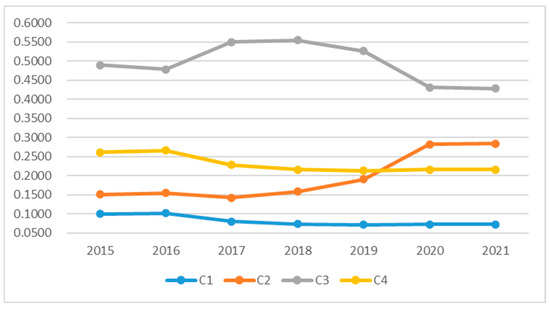 Afterward, the integrated weights from 2015 to 2021 can be calculated in terms of the fundamental rule of moment estimation via Equations (8) and (9). The integrated weights of various years are shown in