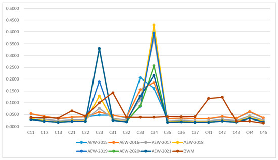 Figure 6. For objective weights, there exists little variance in different years. However, the subjective weights identified via the BWM are extremely varied from the objective weights. Taking C