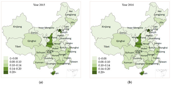 (2) For resources utilization performance, the top four provincial regions are Beijing, Shanghai, Guangdong, and Sichuan. For Beijing, its energy intensity, water consumption per person, and coal consumption relative to total primary energy consumption are all the smallest compared with other regions in every year. Hence, the resources utilization performance of Beijing is superior to the other regions. For Shanghai, Guangdong, and Sichuan, although their preference values of water consumption per person are relatively higher, their technological innovation and use of renewable energy are at a high level, which result in good performance in resources utilization. Nevertheless, the last three positions are occupied by Ningxia, Inner Mongolia, and Xinjiang due to their highest level of energy intensity and water consumption per person. Overall, owing to the upgrading of green and LC technologies as well as energy structure, each provincial region has reduced energy intensity and the proportion of coal consumption. Hence, the resource utilization capacity of each provincial region has steadily improved.