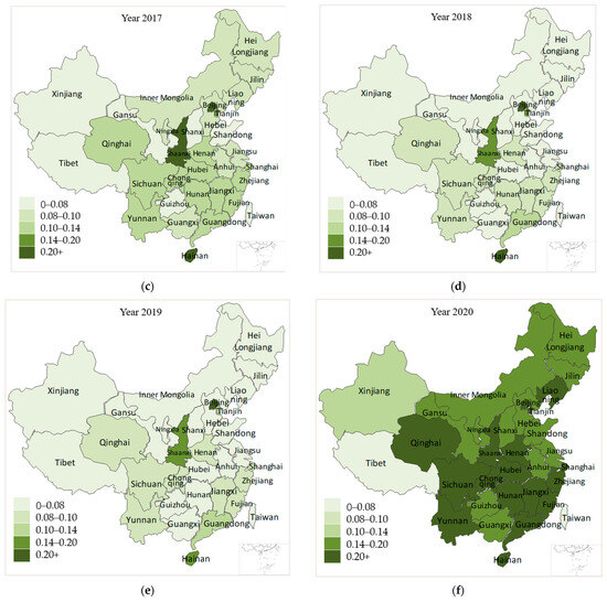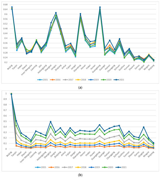 of different regions via Equations (16)–(21), results of which from 2015 to 2021 are illustrated in