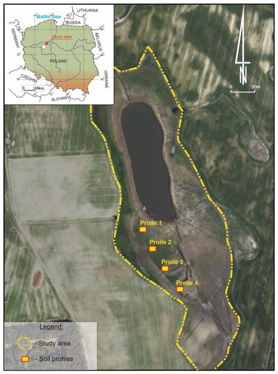 In September 2023, soil samples were taken from four soil profiles, dug down manually to the groundwater level. To ensure consistency and prevent soil variability, the location of soil profiles was selected on the basis of 25 drillings performed along the research transect. The mean soil sample at each sampling site was composed of three subsamples. Additionally, a peat corer was used to collect soil material from each profile to a depth of 110–150 cm. To maintain a consistent temperature, all samples were placed inside polyethylene bags and brought to the laboratory in an insulated box that was sealed against light. In the field, the soil morphology was described according to the field guide for soil description [13]. The degree of peat decomposition was determined in the field using the von Post scale [14], and the organic material thickness at each sampling site was measured by using long steel rods. The classification of the studied soils was carried out by using WRB classification [13] and Polish soil classification [15].