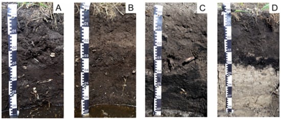 According to the WRB classification [13], the uppermost soil horizons (Ah) of the studied soils (Figure 2) are composed of mulmic material (with 8–20% TOC) with a well-developed granular or subangular blocky structure and a thickness ranging from 25 to 40 cm (Table 1). This material meets the criteria (≥10 cm thickness and ≥12% TOC) for a murszik horizon according to the Polish soil classification [15]. The subsoil horizons of profiles 1–3 are composed of moderately decomposed (hemic) peat material, which includes numerous remnants of common reed vegetation fragments. In the bottom of soil profile 1 slightly decomposed (fibric) reed-sedge peat and sedge-moss peat materials were recorded, while in profile 4 from 32 to 40 cm a thin layer of strongly decomposed (sapric) peat was observed. The described peat materials are generally brown to black in color, with an amorphous, amorphous-fibrous, and fibrous structure. Additionally, an admixture of limnic material (meadow limestone) in sapric peat layer was recorded in profile 3 (Table 1). This type of mineral material predominates below 40 cm in profile 4. The thickness of organic material in the study sites (except site 4) exceeds 5 m, thus meeting the criteria for the Hyperorganic qualifier [13]. Soil profiles 1, 2, and 3 represent the soil reference group of Histosols, while profile 4 is classified as Gleysol. According to the Polish soil classification [15], the studied soils represent the peat soil type (profiles 1 and 2) and murshic soil type (profiles 3 and 4). A detailed soil classification is presented in Table 1.