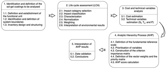 There is a limited body of scientific literature addressing the search for the optimal sol-gel coating based on comparative analytical methods. Moridi et al. (2021) applied the Analytic Hierarchy Process (AHP) to assess the improvement in corrosion resistance of three thin films of ZrO2 and ZrO2–Al2O3 doped with corrosion inhibitors (benzotriazole and cerium nitrate) and deposited via the dip-coating technique. To this end, the films were characterized in terms of chemical composition, crystalline structure, surface morphology and thickness using techniques such as X-ray diffraction and ellipsometry [36]. Other authors, such as Lagopati et al. (2024), employed the TOPSIS method to determine the optimal combination of physicochemical parameters in the synthesis of nanomaterials and to select the best alternative among fifteen sol-gel samples of nanostructured TiO2 [37]. However, none of these studies considered the environmental dimension, which is a crucial aspect in the characterization of ceramic coatings, as it constrains their design and production.