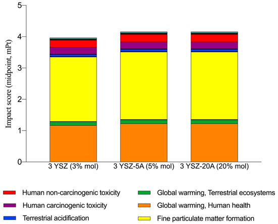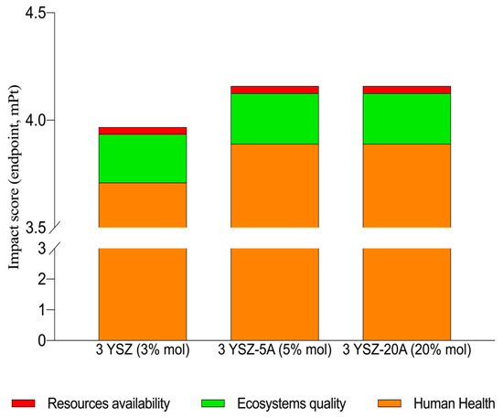Figure 4 shows the results under the endpoint approach for each of the sol-gel coatings under study. In this way, it is possible to compare the different fluids by aggregating the impacts by protection areas. One observes that the least favorable sol-gel coating are 3YSZ-5A (5% mol) and 3YSZ-20A (20% mol), regardless of its molar composition, since they have an impact of 4.16 mPt, of which 3.89 mPt are attributable to the Human Health protection area (HH, 93.5%), 0.24 mPt to the Ecosystems Quality protection area (EQ, 5.8%) and 0.03 mPt to the Resources Availability protection area (RA, 0.7%). It can be seen that the Resources Availability (RA) protection area had hardly any impact.