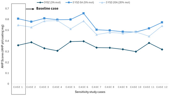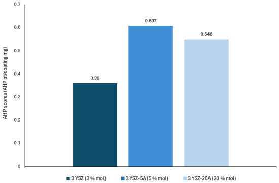 When analyzing Figure 6, it is observed that, despite the variation in the preference weights of the different criteria, the scores remain relatively stable. In all cases, the 3YSZ-5A coating (5% mol) obtains the highest score, followed by the 3 YSZ coating (3% mol), while the 3YSZ-20A coating (20% mol) is in the last position.