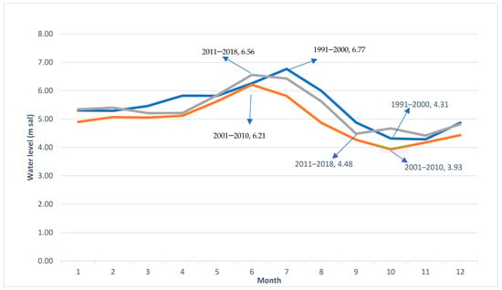 Figure 2 illustrates a shift in the timing of peak flooding over the observed periods, a finding with significant implications for our understanding of hydrological changes. Between 1991 and 2000, the highest flood level occurred in July, reaching 6.77 m sal. However, during the subsequent periods of 2001–2010 and 2011–2018, the flood peak shifted earlier to June, with water levels of 6.21 m sal and 6.56 m sal, respectively. Conversely, the lowest water levels were recorded in September and October. In October, water levels dropped to 4.31 m sal in 1991–2000 and 4.27 m sal in 2011–2018, while the lowest recorded level in 2001–2010 occurred in September at 3.93 m sal. These variations indicate notable temporal shifts in flood dynamics over the decades, underscoring the urgent need for further research and policy action to address these changes.