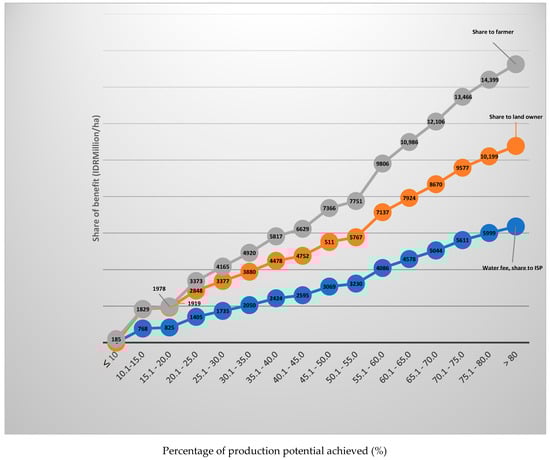 Figure 3 provides a comprehensive view of the proportional distribution levels and risks among partners in the rice farming ventures around Lake Tempe. As farm productivity increases, the distribution levels received benefit by each partner also rise, with farmers receiving the largest share, followed by landowners and water pump owners. However, at ten quintals per hectare or lower productivity levels, landowners and pump owners do not yet receive any share of the output, highlighting a uniform distribution of production risk only under specific conditions. This visual representation clarifies the alignment of risk allocation with each partner’s role and underscores how productivity influences the distribution of benefits. Farmers benefiting from the highest average revenue lead the hierarchy of profit-sharing, illustrating the intricate balance between productivity, risk, and the sharing of returns in these agricultural partnerships.