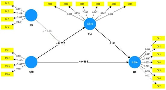 Table 4 shows the explanatory and predictive performance of this model, including R2 and Q2 for study constructs. In social science research, this model explains 50% of organizational performance variance with an R2 value of 0.500. The elements of this model—SCI, risk, and demand uncertainty—explain approximately half of organizational performance variability. A moderate R2 value suggests that this model reveals the link between supply chain dynamics and organizational performance despite other factors affecting performance. The Q2 score for organizational performance is 0.480, over the threshold of 0, indicating predictive relevance [65]. The capacity of this model to predict organizational performance and the postulated relationships is validated by a Q2 score above zero.