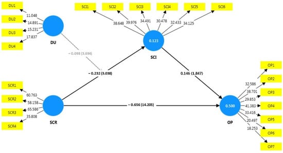 Table 3 shows discriminant validity results from the Heterotrait–Monotrait Ratio (HTMT), which measures study component dissimilarity. This table shows the correlation between each pair of constructs. The HTMT score between demand uncertainty (DU) and organizational performance (OP) is 0.893, exceeding the 0.85 criterion. The two constructs appear closely related, suggesting that they may not be independent, necessitating further study. Demand uncertainty and SCI have HTMT values of 0.239, which are far below the threshold. This shows that these two notions are distinct, supporting discriminant validity. These two constructs are distinct since the HTMT score for demand uncertainty and SCR is 0.670, below 0.85. The HTMT scores for organizational performance for SCI (0.388) and risk (0.781) are well below the 0.85 criteria, indicating discriminant validity. Organizational success is distinct from SCI and risk. HTMT values for SCI and risk are 0.270, indicating independent constructions. Table 2 shows good discriminant validity for the study constructs. No HTMT results above 0.85, confirming the uniqueness of constructs and the resilience of the measuring model.