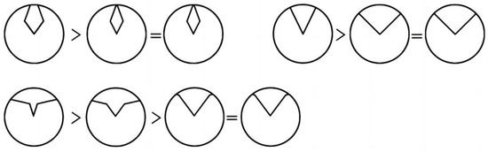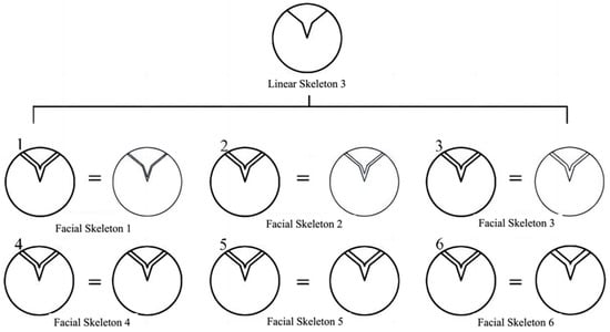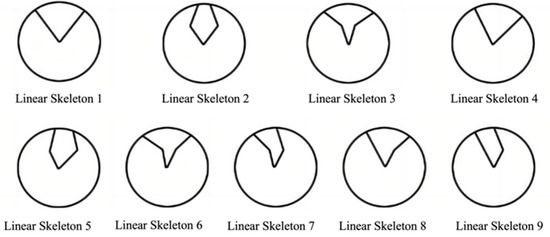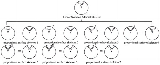 The facial skeleton refers to the surface features of the spokes. Each linear skeleton can be associated with several facial skeletons, which do not change with the linear skeleton variations but only reflect changes in the spoke’s area. These skeletons focus on defining the width and area of the spokes. The planar skeletons are further categorized into six degrees to represent common spoke area variations. Figure 9 provides a graphical representation of the planar skeleton.