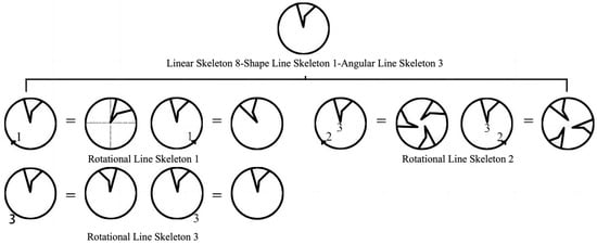 Each linear skeletal structure corresponds to multiple shape skeletal lines and angular skeletal lines, which define the variations in the included angle of the V-shaped curve. Each type of linear skeletal structure or shape skeletal structure is associated with seven angular skeletal lines, representing seven different spoke angles within the same skeletal framework. Additionally, proportional skeletal lines are classified into horizontal proportional skeletal lines and vertical proportional skeletal lines, which regulate the contour lines by controlling horizontal and vertical transformations. The eight categorical variations of linear skeletal structures are detailed in Table 3: