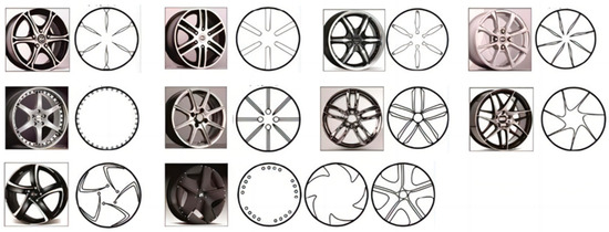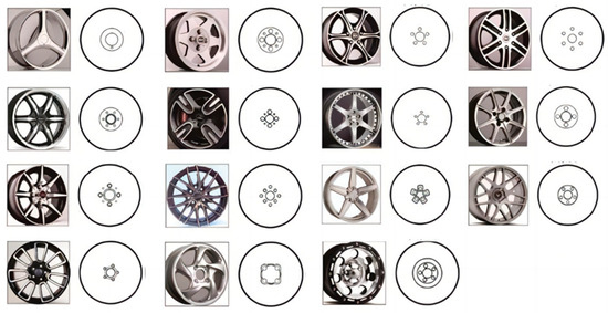 First, a comprehensive dataset of wheel designs was collected from various sources, including automotive design databases, brand websites, and wheel shapes generated using digital design software. The images were taken primarily from the frontal view, which is the most common visual representation of a wheel. Using image processing software (e.g., Photoshop 2022 or MATLAB R2023a), all images were standardized to the same size to ensure uniformity of the dataset. Vectorization algorithms were then applied to extract the underlying shapes of the rims, enabling detailed analysis and curve extraction, as shown in Figure 1.