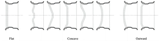 - Shape line skeleton: Through a comprehensive analysis of wheel hub images combined with shape theory, the nine types of linear skeletons can be subdivided into different shape line skeletons. Each linear skeleton corresponds to multiple shape variants. The shape line skeleton modifies the VDMC by adjusting the slopes of the control points’ connecting lines, resulting in variations in the shape. The shape line skeleton is classified into six or nine types, depending on the symmetry of the linear skeleton. Asymmetrical skeletons (such as linear skeletons five, six, and seven) introduce complex variations, leading to more diverse results.