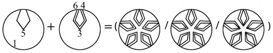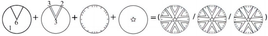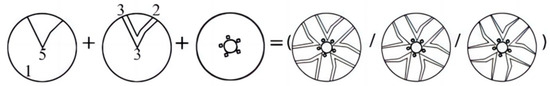 The first rotational skeletal line represents rotation around a central point, occurring in both clockwise and counterclockwise directions. The second rotational skeletal line defines the rotation of the V-shaped curve at a specific included angle relative to the centerline, also in both clockwise and counterclockwise directions. The third rotational skeletal line characterizes the mirrored transformation of the V-shaped curve along the centerline. In the diagram, apart from the numerical value at the central point, which indicates the number of spokes, all other numbers exclusively correspond to a specific type of rotational skeletal line. For instance, “1” represents the first rotational skeletal line, while “2” denotes the second rotational skeletal line.