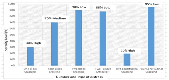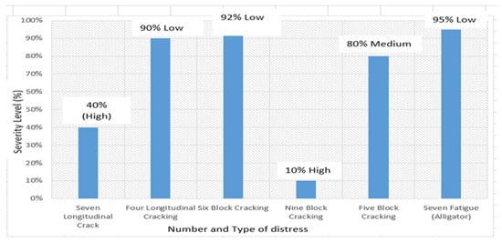Figure 3 presents the three types of defects (seven block cracks, two fatigue (alligator) cracks, and six longitudinal cracks) at Al Idrisi Street in Amman City. Figure 3 was plotted using the conducted visual inspection data for PCI Evaluation, where the x-axis data represent the type and number of defects. At the same time, the y-axis represents the severity level (low, medium, or high) as a percentage for each defect type based on the custom PCI rating scale described in Section 3.2, which can easily give an indication about the situation of the pavement. Based on the drawing, seven locations on AlIdrisi Street suffer from block cracking; one of them has a high severity level (approximately 30%); four of them have a medium severity level (approximately 70%); and the remaining two have a low severity level (90%) based on the PCI method. These results match and agree with the results from image processing techniques as shown in Table 10, where the severity level high is within (0–57%), whereas the severity medium is within (58–85%), and the severity low is within (86–100%). This means that there is a matching and agreement between the results from the PCI method and the results from image processing techniques. Moreover, the results of fatigue (alligator) and longitudinal crack based on the PCI method at AlIdrisi Street also validate and match the results from image processing techniques (Table 10). The same comparison for Al Kura, Der Abi Saeed, and Natifa of Irbid City was performed as shown in Figure 4. Figure 4 was plotted based on the results of the PCI method between the number and type of defect (x-axis) and severity level for each type (y-axis). There are eleven longitudinal cracks, twenty block cracks, and seven fatigue (alligator) with different severities (low, medium, and high). The situation for Al Kura, Der Abi Saeed, and Natifa of Irbid City data showed that there are seven longitudinal cracks with approximately 40% (high severity level), while the remaining four longitudinal cracks have a percentage of 90 (low severity level). These values of severity level agree with image processing results as seen in Table 10. The same comparison was performed for the remaining defects of the Al Kura, Der Abi Saeed, and Natifa of Irbid City. In conclusion, the results from Figure 3 and Figure 4 are consistent and in agreement with the conducted data and results from captured images for the validation process.