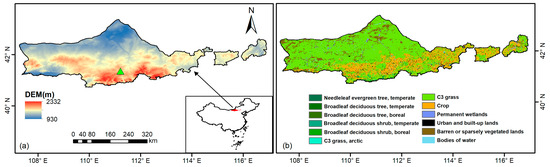 This work focuses on the Yinshanbeilu region (107°17′–116°53′ E and 40°43′–43°23′ N), located in central Inner Mongolia, as shown in Figure 1a. Situated in the transitional zone between the Yinshan Mountains and the Mongolian Plateau, it is a typical area of agricultural–livestock farming interaction, covering a total area of 97,250.5 km2. The landscape of the Yinshanbeilu region is characterized by high plains, low hills, and basins, with altitudes decreasing from south to north. The region experiences an arid to semi-arid climate, with average annual precipitation ranging from 200 to 400 mm, a mean annual temperature between 1.3 and 3.9 °C, and annual evaporation ranging from 1748 to 2300 mm [52]. Figure 1b shows the plant functional types (PFTs) of Yinshanbeilu that are derived from Ran and Ma [53]. The primary vegetation types are forest steppe and desert steppe, with grasslands predominating in the north and crops in the south. Most of the region consists of desert grasslands, characterized by a simple ecosystem structure, making it extremely vulnerable to both human activities and natural disasters.