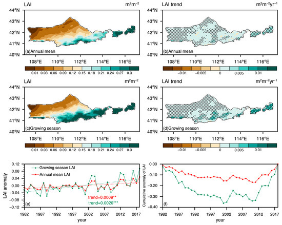 Spatial distribution of the multi-year average (a) annual mean LAI and (c) growing season LAI, and the linear trend in (b) annual mean LAI, and (d) growing season LAI from 1982 to 2018. Dots indicate regions where the linear trends are statistically significant at p = 0.05. Interannual time series of (e) LAI anomaly, and (f) cumulative LAI anomaly from 1982 to 2018. ** and *** represent statistical significance at p = 0.01 and p = 0.001, respectively.