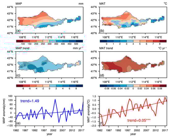 Spatial distribution of the (a) mean annual precipitation (MAP) and (b) mean annual temperature (MAT), and the linear trend in (c) MAP and (d) MAT from 1982 to 2018. Dots indicate regions where the linear trends are statistically significant at p = 0.05. Interannual time series of (e) MAP anomaly and (f) MAT anomaly from 1982 to 2018. *** represents statistical significance at p = 0.001.