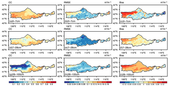 Spatial distribution of (a,d,g) correlation coefficient, (b,e,h) root mean square error, and (c,f,i) mean bias between simulated and ERA5-Land soil moisture from 2000 to 2018 at different depths: (a–c) 0–7 cm, (d–f) 7–28 cm, and (g–i) 28–100 cm.