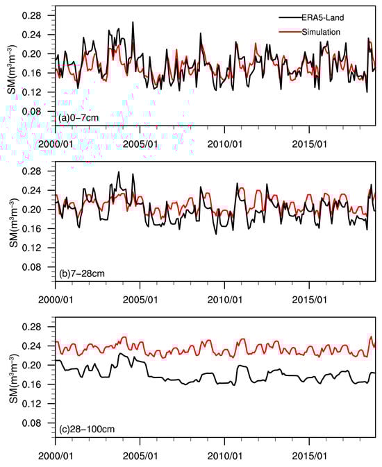 Comparisons of monthly time series between simulated soil moisture (red lines) and ERA5-Land soil moisture (black lines) from 2000 to 2018 at depths of (a) 0–7 cm, (b) 7–28 cm, and (c) 28–100 cm.