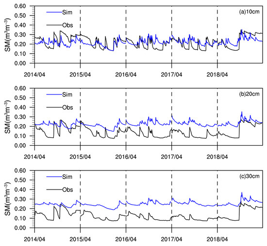 Comparisons of daily time series between simulated soil moisture (blue lines) and observed soil moisture (black lines) from 2014 to 2018 at depths of (a) 10 cm, (b) 20 cm, and (c) 30 cm.