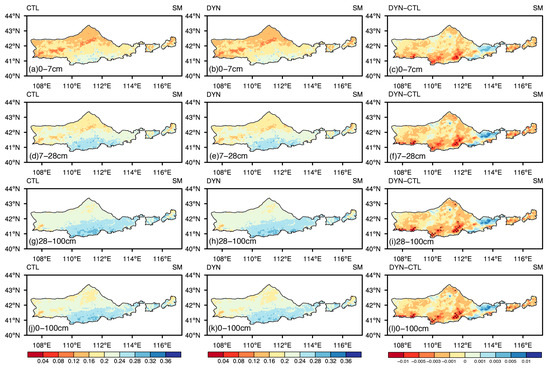 Spatial patterns of simulated annual average soil moisture (units: m3 m−3) at soil depths of (a–c) 0–7 cm, (d–f) 7–28 cm, (g–i) 28–100 cm, and (j–l) 0–100cm from the (a,d,g,j) CTL and (b,e,h,k) DYN; and (c,f,i,l) the difference of soil moisture between CTL and DYN.