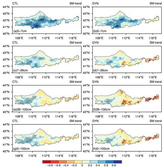 Spatial distributions of the linear trends in (a,b) 0–7 cm, (c,d) 7–28 cm, (e,f) 28–100 cm, and (g,h) 0–100 cm soil moisture (units: 10−3 m3 m−3 yr−1) for (a,c,e,g) CTL and (b,d,f,h) DYN from 1982 to 2018.