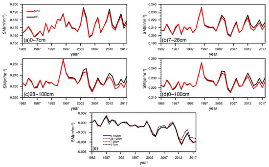 Interannual variations in the (a) 0–7 cm, (b) 7–28 cm, (c) 28–100 cm, (d) 0–100 cm soil moisture for CTL (black lines) and DYN (red lines) from 1982 to 2018, and (e) the difference between CTL and DYN for the four soil profiles.