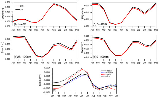 Seasonal variations in the (a) 0–7 cm, (b) 7–28 cm, (c) 28–100 cm, and (d) 0–100 cm soil moisture for CTL (black lines) and DYN (red lines) from 1982 to 2018, and (e) the difference between CTL and DYN for the four soil profiles.