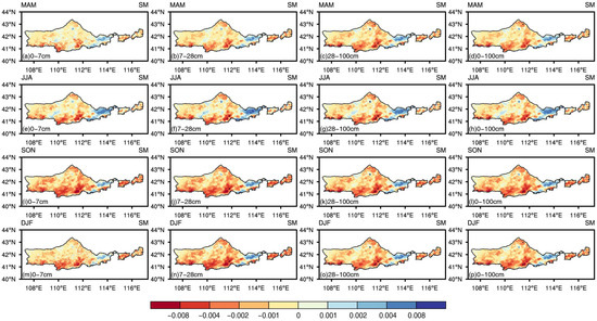 For the regional averages (Figure 9), surface soil moisture (0–7 cm) exhibited a statistically significant increasing trend (2.97 × 10−4 m3 m−3 yr−1, p < 0.05) with considerable interannual variability, primarily driven by variations in precipitation, evaporation, and plant transpiration. However, the interannual variations in soil moisture diminished with increasing soil depth. Specifically, shallow soil moisture (7–28 cm) exhibited a smaller fluctuation, with a non-significant increasing trend. Similarly, the changes in deep soil moisture (28–100 cm) were also relatively minor, exhibiting a non-significant decreasing trend. These variations in deeper soil moisture were primarily driven by factors such as the groundwater table, vertical water movement, and water uptake by plant roots.